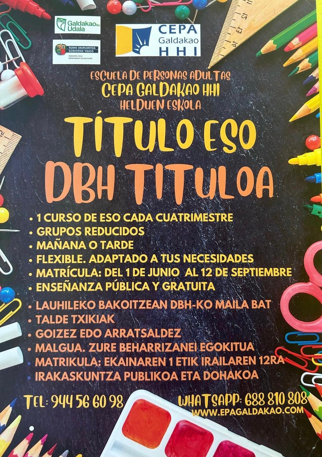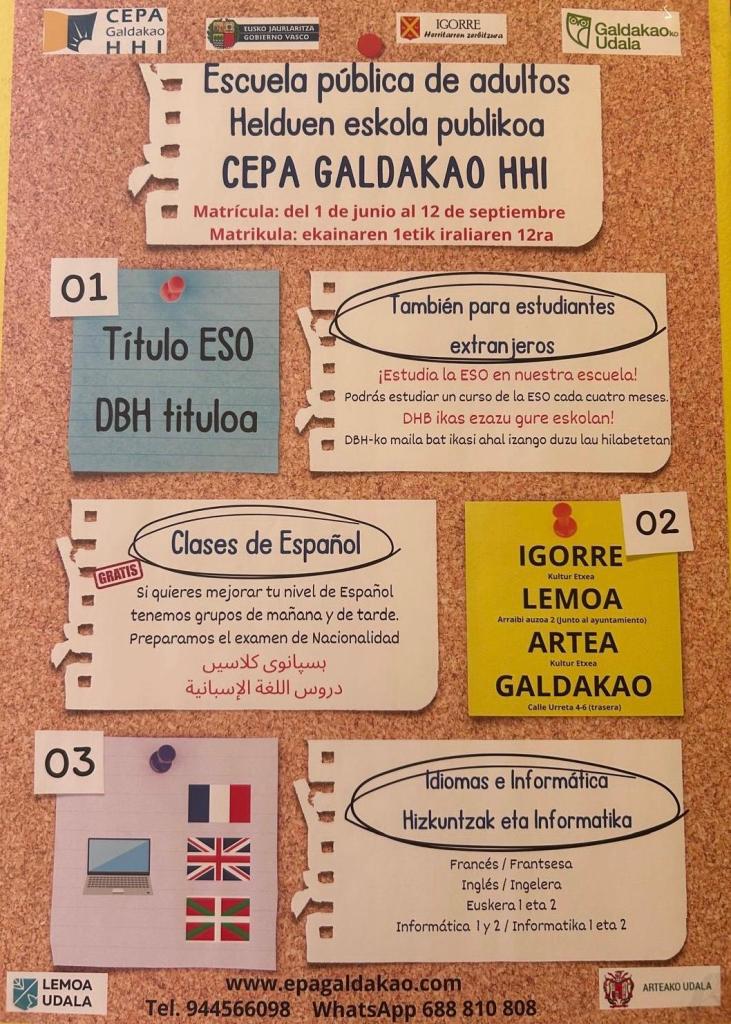[eus] CEPA Galdakao HHI Helduen Eskolan izena emateko epea zabalik egongo da irailaren 12ra arte, eta Lemoan ere eskaintza izango da. Helduentzako eskola publiko eta doakoa da, eta bizitza osoko ikasketak sustatzeko aukera paregabea eskaintzen du.