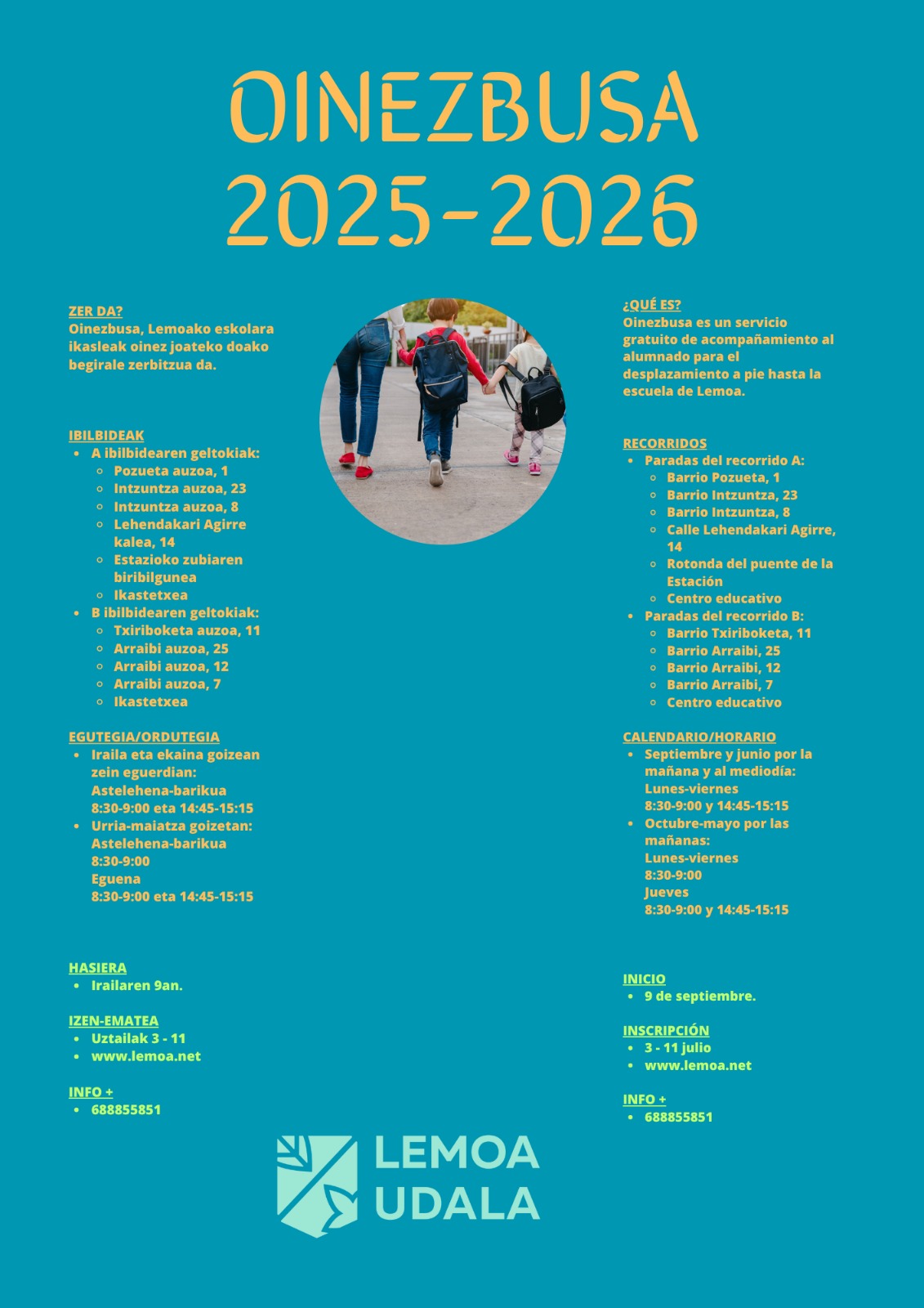 [eus] Iraileko lehenengo eskola egunean (irailak 9) Oinezbusa 2025-2026 jarriko da martxan, ikasleak Lemoako eskolara oinez joateko doako begirale zerbitzua. Irailean eta ekainean goizeko zein eguerdiko ordutegia izango du zerbitzuak: 08:30-9:00 eta 14:45-15:15. Urritik maiatzera, berriz, goizeko zerbitzua egongo da egunero, eta, eguenetan, eguerdiko ordutegia egongo da ere.