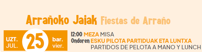 [eus] Arrañoko auzoak bere jai tradizionalak ospatuko ditu uztailaren 25ean, ostirala. Egunari 12:00etan emango zaio hasiera meza batekin, eta ondoren esku pilota partidak eta luntxa izango dira. Festa eguna elkartasuna, kirola eta giro ona uztartzeko aukera paregabea izango da.