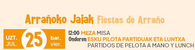 [eus] Arrañoko auzoak bere jai tradizionalak ospatuko ditu uztailaren 25ean, ostirala. Egunari 12:00etan emango zaio hasiera meza batekin, eta ondoren esku pilota partidak eta luntxa izango dira. Festa eguna elkartasuna, kirola eta giro ona uztartzeko aukera paregabea izango da. [cas] El barrio de Arraño celebrará sus tradicionales fiestas el viernes 25 de julio. La jornada … Irakurtzen jarraitu Arrañoko jaiak uztailaren 25ean ospatuko dira – Arraño celebrará sus fiestas el próximo 25 de julio