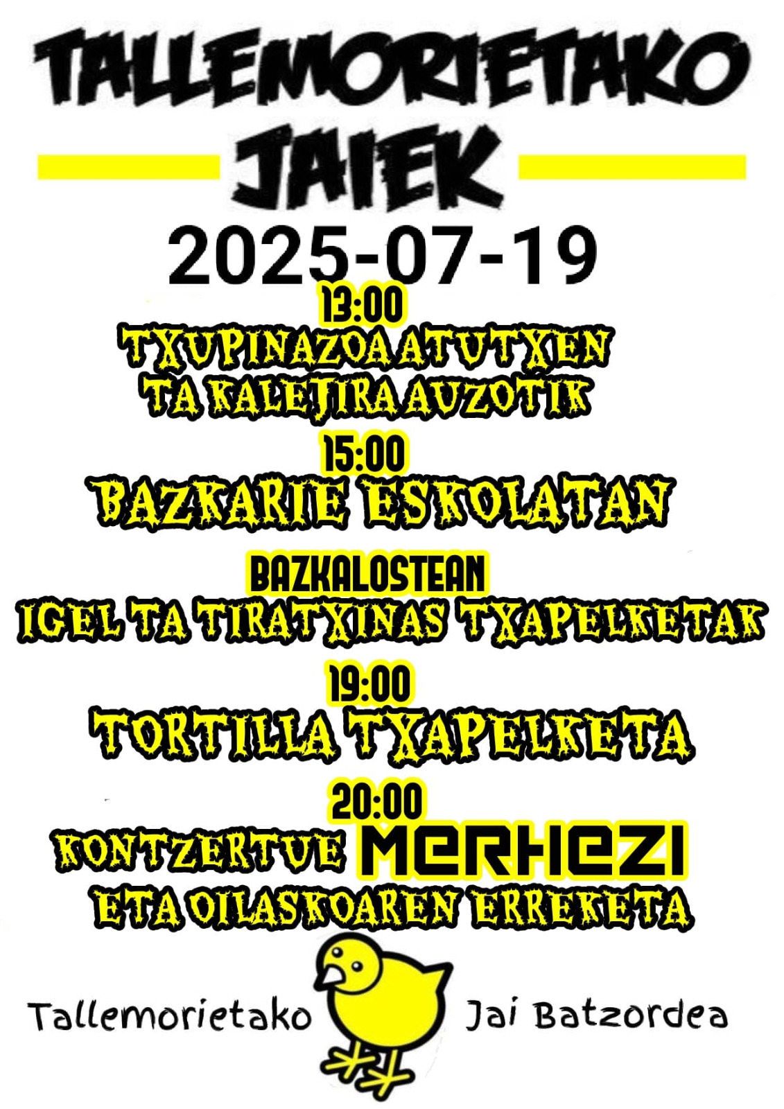 [eus] Tallerreta eta Lemorieta auzoek bere jaiak ospatuko dituzte uztailaren 19an, eta auzoko Jai Batzordeak egun osoko egitaraua antolatu du: kalejira, bazkaria, igel txapelketa, kontzertua… [cas] Los barrios de Tallerreta y Lemorieta celebran sus fiestas el 19 de julio, y la Comisión de Fiestas del barrio ha organizado un programa completo: kalejira, comida, concurso de … Irakurtzen jarraitu Badatoz Tallemorietako jaiak! – ¡Llegan las fiestas de Tallemorieta!