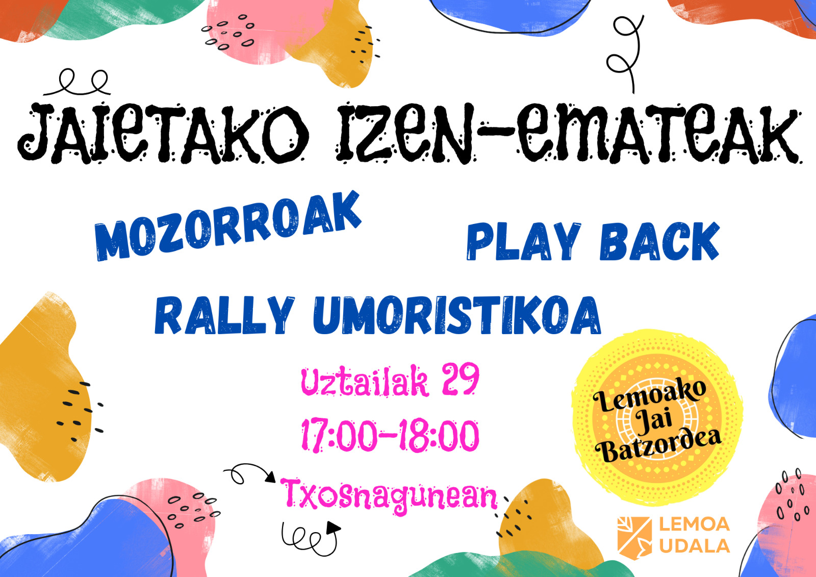 [cas] Las fiestas de Lemoa están a punto de llegar y la Comisión de Fiestas ha preparado un programa de 6 días con actividades para todos los públicos. Del 29 de julio al 3 de agosto, las calles y plazas de Lemoa se llenarán de actividades culturales y de ocio. La música contará con un especial protagonismo, ya que durante las fiestas habrá ocasión de disfrutar de diversos conciertos: Süne, Alarma morea, Bunkker, Zeinke… ¡y mucho más!