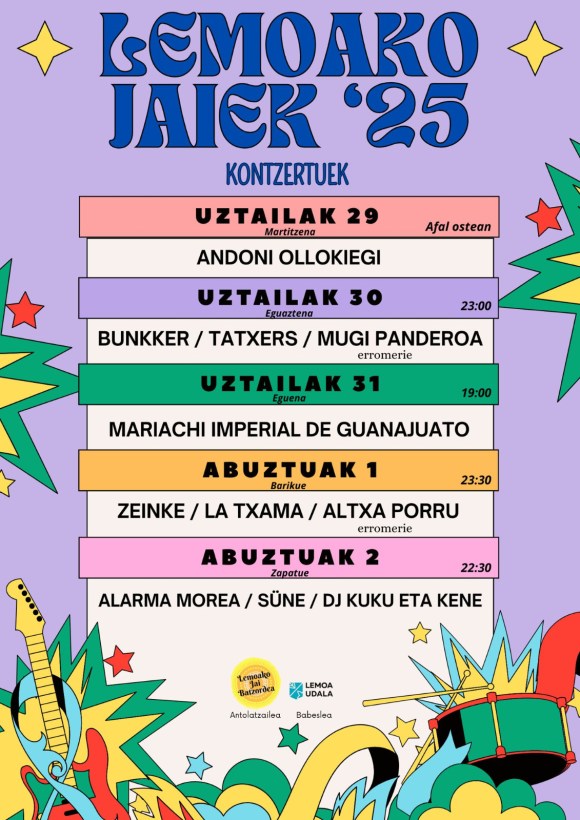 [eus] Lemoako jaiak heltzear dira, eta Jai Batzordeak 6 eguneko egitaraua prestatu du, publiko guztientzako ekintzekin. Uztailaren 29tik abuztuaren 3ra Lemoako kale eta plazak kultura eta aisialdi ekimenez beteko dira. Musikak protagonismo berezia izango du, hainbat kontzertu izango baitira jaietan zehar: Süne, Alarma morea, Bunkker, Zeinke… eta askoz gehiago!