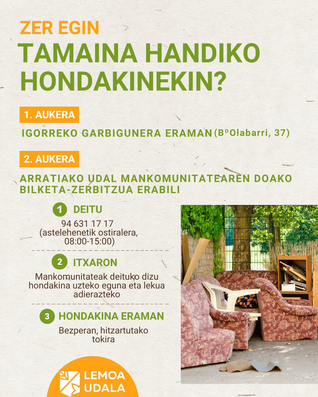 [eus] Lemoako Udalak herritarrei gogorarazi nahi die etxeko tamaina handiko hondakinak —hala nola altzari zaharrak, koltxoiak edo tresna zaharkituak— ezin direla edukiontzi arruntetan utzi. Horrelako hondakinak Garbigunera eraman behar dira, eta Lemoaren kasuan, Igorreko Garbigunea da erreferentzia-puntua.