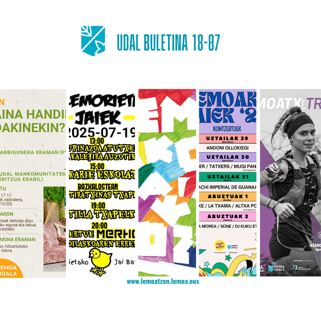 Atalak Udal buletina- Boletín digital Udal Buletina Uztailak 18 de julio Gehiago irakurri titularraren gainean klikatuz Leer más haciendo clic sobre el titular Post author Garatzailea: lemoatzen Post date 2025-07-18 Boletín Municipal San Inazioko ermita konpondu du Udalak – El Ayuntamiento restaura la ermita de San Inazio Bulego berriak eskolako zuzendaritzarako – Nuevas oficinas para la dirección de la escuela Zinema estreinaldia Lemoan: Irati filmaren proiekzioak harrera bikaina izan zuen – Estreno de cine en Lemoa: la proyección de Irati tuvo una gran acogida Tamaina handiko hondakinak modu egokian kudeatzeko informazioa – Información sobre la correcta gestión de residuos voluminosos Badatoz Tallemorietako jaiak! – ¡Llegan las fiestas de Tallemorieta! Arrañoko jaiak uztailaren 25ean ospatuko dira – Arraño celebrará sus fiestas el próximo 25 de julio Guztiontzako Lemoako jaiak – Fiestas de Lemoa para todas y todos Aurten morez jantziko da IX. LEMOATX TRAIL! – ¡Este año vestiremos de morado IX. LEMOATX TRAIL! Lemoan Lan: asteroko lanpostu eskaintzak – Ofertas semanales de empleo Comparte: Share on X (Opens in new window) X Share on Facebook (Opens in new window) Facebook Atsegin dut Kargatzen... ← Lemoan Lan: asteroko lanpostu eskaintzak – Ofertas semanales de empleo → Lemoan Lan: asteroko lanpostu eskaintzak – Ofertas semanales de empleo