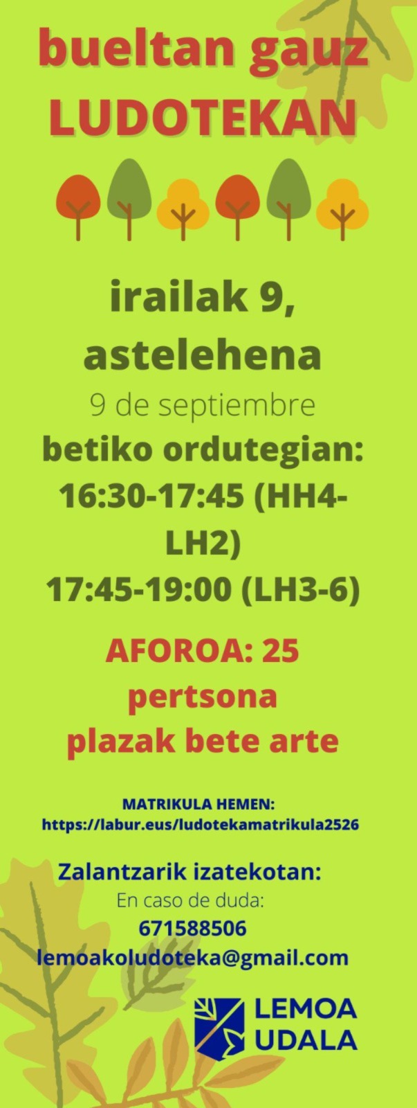 [eus] Lemoako txikienek udal ludotekaz gozatzeko aukera izango dute ikasturte honetan ere; izan ere, ludoteka bueltan da. Ordutegia betikoa izango da: 16:30etik 17:45era HH4-LH2 ikasleen kasuan, eta 17:45etik 19:00etara LH3-6 ikasleenean. Plazak mugatuak dira, beraz, ez itxaron gehiagorik! Izen-ematea: https://labur.eus/ludotekamatrikula2526. [cas] Los más pequeños y pequeñas de Lemoa podrán disfrutar también este curso de la … Irakurtzen jarraitu Bueltan da ludoteka! – ¡La ludoteca está de vuelta!