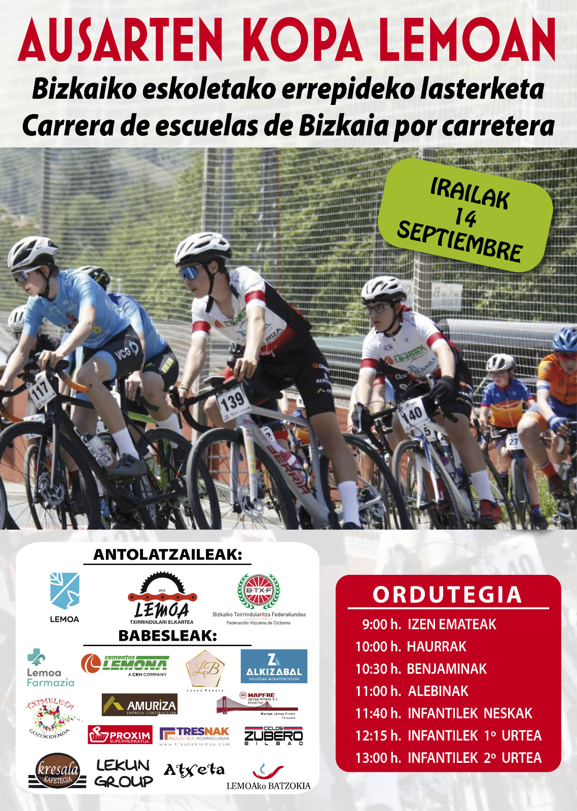[cas] El próximo domingo 14 de septiembre, Lemoa volverá a ser escenario de la AUSARTEN KOPA, una cita de las escuelas de ciclismo organizada por los clubes locales, la Federación Vizcaína de Ciclismo y el Ayuntamiento de Lemoa.