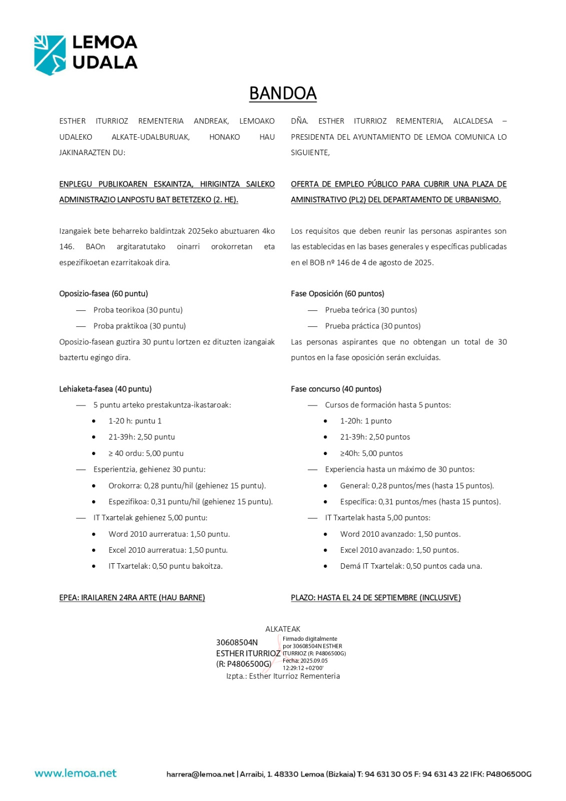 [eus] Lemoako Udalak hautaketa-prozesua abiarazi du Hirigintza sailean administrari baten plaza betetzeko. Prozesuak oposizio- eta lehiaketa-faseak izango ditu, eta guztira 100 puntu eskuratu ahal izango dira.