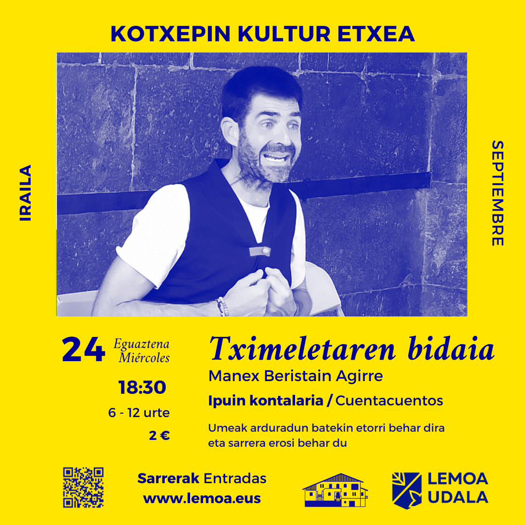 [eus] Irailaren 24an, eguaztena, 18:30ean, Manex Beristain Agirre ipuin kontalariak Tximeletaren bidaia eskainiko du Kotxepin Kultur Etxean. 6 eta 12 urte bitarteko haurrei zuzendutako saio honetan, irudimenaren bidez bidaia zirraragarria bizitzeko aukera izango dute. Haurrak heldu batekin etorri behar dira, eta honek ere sarrera erosi beharko du. Sarrerak 2 €-tan daude, eta honako esteka honetan … Irakurtzen jarraitu «Tximeletaren bidaia» ipuin kontaketa Lemoan – Cuentacuentos «Tximeletaren bidaia» en Lemoa