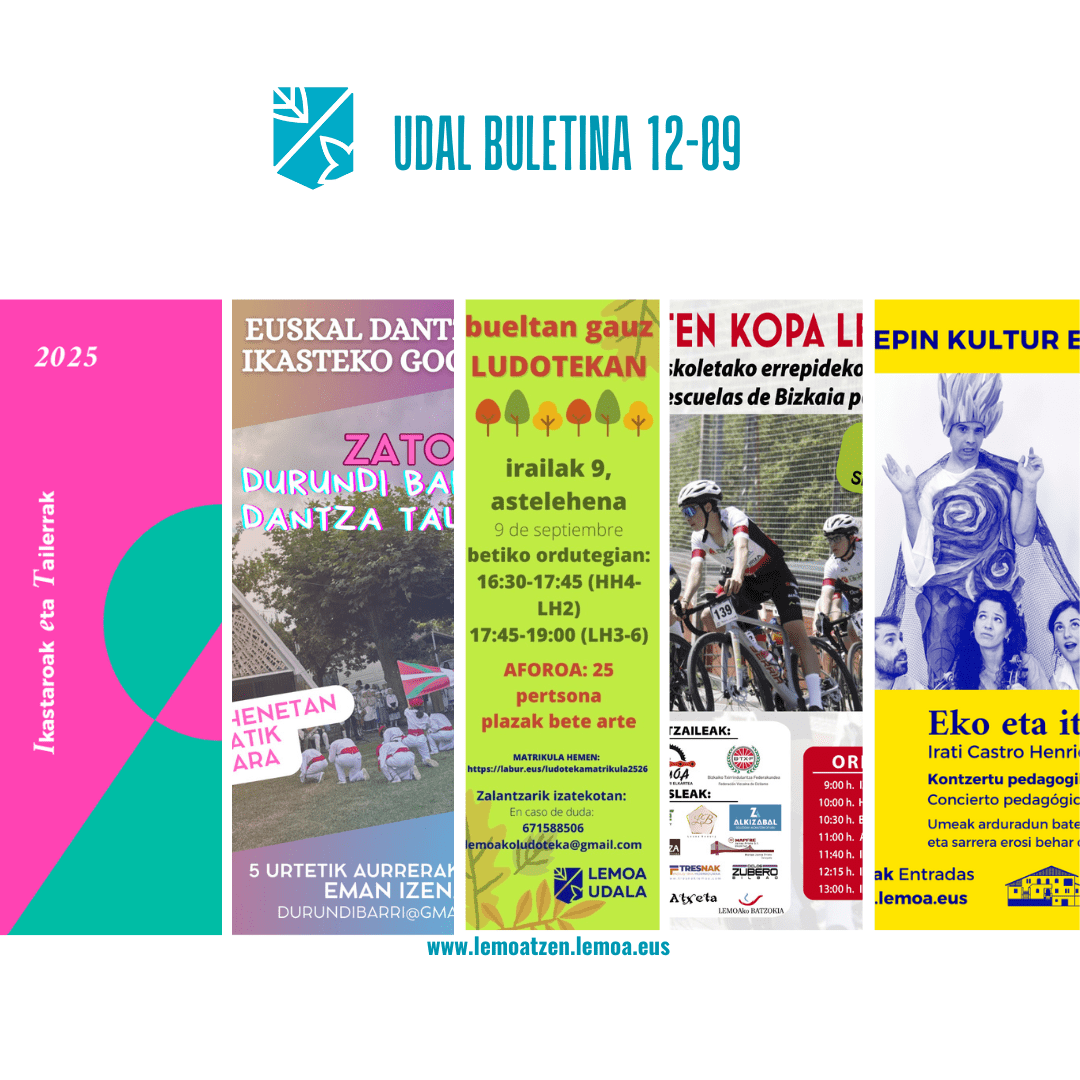 Atalak Udal buletina- Boletín digital Udal Buletina Irailak 12 de septiembre Gehiago irakurri titularraren gainean klikatuz Leer más haciendo clic sobre el titular Post author Garatzailea: lemoatzen Post date 2025-09-12 Boletín Municipal Bukatuta eskolako zuzendaritzako bulego eta gela berriak – Finalizadas las nuevas oficinas y salas de la dirección de la escuela Enplegu publikoaren eskaintza: Hirigintza saileko administrazio lanpostua – Oferta de empleo público: plaza de administrativo del departamento de Urbanismo Zure ahotsa garrantzitsua da! Parte hartu Lemoako Irisgarritasun Planaren inkestan – ¡Tu voz cuenta! Participa en la encuesta del Plan de Accesibilidad de Lemoa Oinezbusa berriro martxan ikasturtehasierarekin – El Oinezbusa vuelve a ponerse en marcha con el inicio del curso Udal ikastaroak eta tailerrak 2025-2026 – Cursos y talleres municipales 2025-2026 Lemoatik kanpo euskara ikasi baduzu dirulaguntza eska dezakezu urriaren 15era arte – Si has estudiado euskera fuera de Lemoa puedes solicitar una subvención hasta el 15 de octubre Bueltan da ludoteka! – ¡La ludoteca está de vuelta! Domekan AUSARTEN KOPA 2025 izango da Lemoan – Lemoa acogerá este domingo la AUSARTEN KOPA 2025 Durundi Barri dantza taldearekin euskal dantzak ikasteko aukera – Oportunidad para aprender danzas vascas con el grupo Durundi Barri Zuhaitz Gurrutxagaren «Nortasun agiria» bakarrizketa Lemoan – El monólogo «Nortasun agiria» de Zuhaitz Gurrutxaga en Lemoa «Tximeletaren bidaia» ipuin kontaketa Lemoan – Cuentacuentos «Tximeletaren bidaia» en Lemoa «Eko eta itsasoa» kontzertu pedagogikoa Lemoan – Concierto pedagógico «Eko eta itsasoa» en Lemoa Lemoan Lan: asteroko lanpostu eskaintzak – Ofertas semanales de empleo Comparte: Share on X (Opens in new window) X Share on Facebook (Opens in new window) Facebook Atsegin dut Kargatzen... ← Lemoan Lan: asteroko lanpostu eskaintzak – Ofertas semanales de empleo → Arraibiko mural berria: artea, Lemoako edertasunaren oroigarri – Nuevo mural en Arraibi: el arte como recordatorio de la belleza de Lemoa