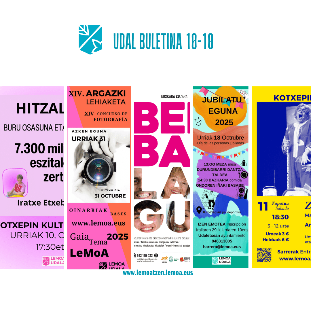 Atalak Udal buletina- Boletín digital Udal Buletina Urriak 10 de octubre Gehiago irakurri titularraren gainean klikatuz Leer más haciendo clic sobre el titular Post author Garatzailea: lemoatzen Post date 2025-10-10 Boletín Municipal Lemoako Udalak tona bat baino gehiago hondakin kendu du erreketatik – El Ayuntamiento de Lemoa ha retirado más de una tonelada de residuos de los ríos Lemoatik kanpo euskara ikasi baduzu dirulaguntza eska dezakezu urriaren 15era arte – Si has estudiado euskera fuera de Lemoa puedes solicitar una subvención hasta el 15 de octubre «Euskara ZU zara» lelopean, zabalik dago Lemoako Berbalagunen izena emateko epea – Bajo el lema «Euskara ZU zara», está abierto el plazo de inscripción en Berbalagun Lemoa Iratxe Etxebarriaren hitzaldia: buru osasuna eta autozaintza – Charla sobre salud mental y autocuidado con Iratxe Etxebarria Gogoratu martxan dela Lemoako XIV. Argazki Lehiaketa – Recuerda que sigue en marcha el XIV Concurso de Fotografía de Lemoa Jubilatuen Eguna 2025 – Día de las Personas Jubiladas 2025 «Zaintzaren dantza» bihar Kotxepin Kultur Etxean – «Zaintzaren dantza» mañana en Kotxepin Kultur Etxea Urriaren 17an Postal kolekzionistak taldearen kontzertua Kotxepinen – El 17 de octubre concierto de Postal kolekzionistak en Kotxepin «Zapata gorriak» ipuin kontaketa urriaren 24an Kotxepin – Sesión de cuentacuentos «Zapata gorriak» el 24 de octubre en Kotxepin Lemoan Lan: asteroko lanpostu eskaintzak – Ofertas semanales de empleo Comparte: Share on X (Opens in new window) X Share on Facebook (Opens in new window) Facebook Atsegin dut Kargatzen... ← Lemoan Lan: asteroko lanpostu eskaintzak – Ofertas semanales de empleo → Lemoan Lan: asteroko lanpostu eskaintzak – Ofertas semanales de empleo
