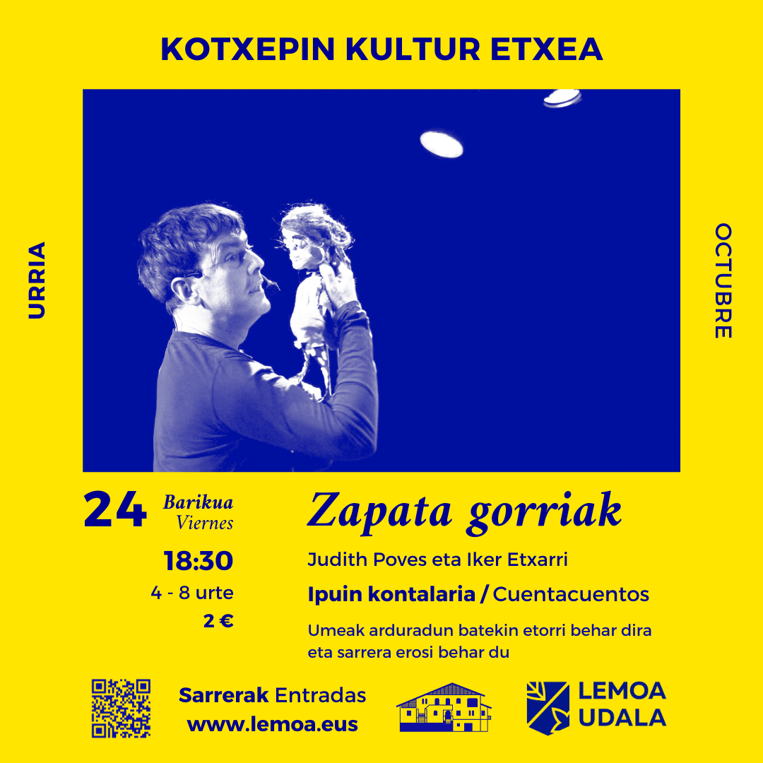 [CAS] La pareja de cuenta-cuentos Judith Poves e Iker Etxarri llega a Lemoa con el espectáculo ‘Zapata gorriak’. La actuación será en la casa de cultura Kotxepin, hoy, a las 18:30 horas. Será un relato dirigido a niños de entre 4 y 8 años, pero los niños tienen que ir acompañados de un adulto y comprar la entrada. Cada entrada cuesta 2 euros.