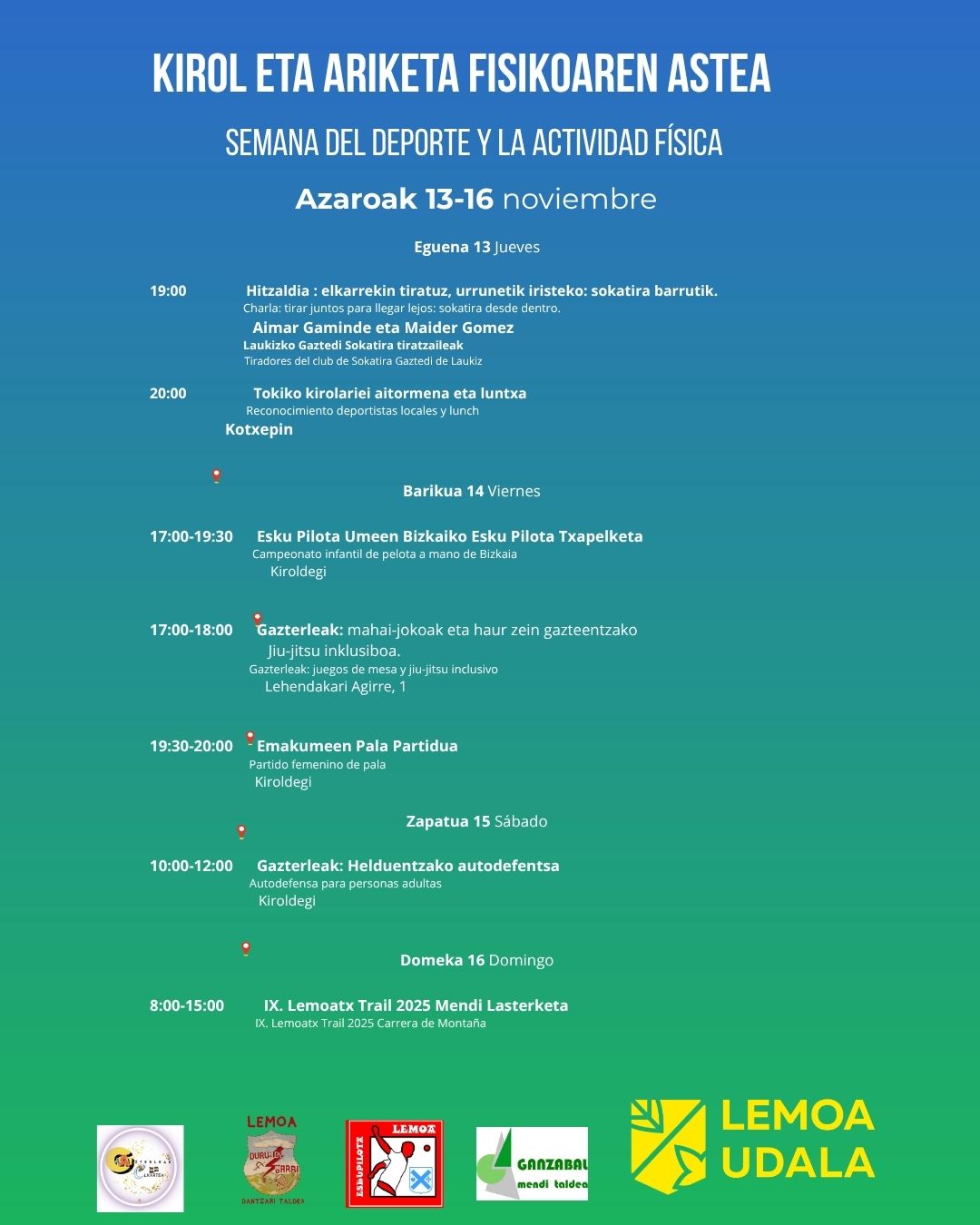 [CAS] El Ayuntamiento de Lemoa ha organizado del 13 al 16 de noviembre la Semana del Deporte y la Actividad Física. Lemoa apuesta una vez más por impulsar el deporte y la actividad física como medida para mejorar la calidad de vida de las vecinas y vecinos del pueblo. Junto a la dotación de nuevas infraestructuras deportivas, Lemoa apuesta por la sensibilización social.