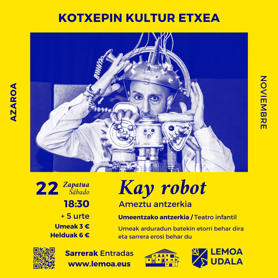 Zapatu honetan, azaroaren 22an, 18:30ean, Ameztu Antzerkia konpainiak ‘Kay Robot’ txotxongilo komedia eskainiko du. Hiperteknologiaren tiraniari buruzko txotxongilo komedia kezkagarri eta ameslaria da, eta 5 urtetik gorakoentzat pentsatuta dago. Sarrerak (6 € helduak eta 3 € haurrak) salgai daude.