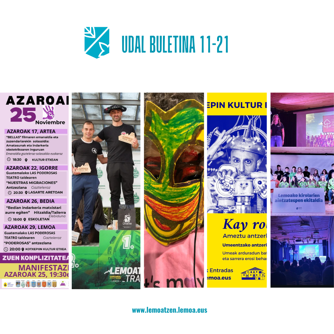 Atalak Udal buletina- Boletín digital Udal Buletina Azaroak 21 de noviembre Gehiago irakurri titularraren gainean klikatuz Leer más haciendo clic sobre el titular Post author Garatzailea: lemoatzen Post date 2025-11-21 Boletín Municipal Lemoako Udalak Emakumeenganako Indarkeriaren aurkako Nazioarteko Egunagatik antolatu diren ekintzetan parte hartzeko deia egin du / Llamamiento a participar en las actividades por el Día Contra La Violencia Machista Erorikoak prebenitzeko ikastaroa egingo da Lemoako Nagusien Etxean / Taller de prevención de caídas Bigarren eskuko azoka egingo da domekan / Feria de segunda mano este domingo Tokiko merkataritza bultzatzeko zozketa antolatu dute Udalak eta Lemoako Merkataritza, Ostalaritza eta Zerbitzu Enpresak / Impulso al comercio local de Lemoa Kotxepineko programazioa / Programación de Kotxepin Lemoan jokatuko da kluben arteko Bizkaia txapelketa / El campeonato entre clubes Bizkaia se disputará en Lemoa Udalak herriko kirolariak omendu eta aintzatetsi ditu Kirol eta Ariketa Fisikoaren Astean / Reconocimiento a los deportistas locales de Lemoa Más euskara en el ámbito laboral y las empresas de Arratia gracias a EusGara Euskararen Eguna, ate joka / Y pronto, el Día del Euskara Nekazaritza sektorean belaunaldi erreleboari buruzko hitzaldiak egingo dira hurrengo astean / Jornadas de relevo generacional en el sector agrario Lemoa ikasleen ongizate sozioemozionalarekin konprometitua / Lemoa comprometido con el bienestar socioemocional del alumnado LEMOAN LAN: Lan-aukerak // Oportunidades de empleo Comparte: Share on X (Opens in new window) X Share on Facebook (Opens in new window) Facebook Atsegin dut Kargatzen... ← Lemoa ikasleen ongizate sozioemozionalarekin konprometitua / Lemoa comprometido con el bienestar socioemocional del alumnado → Lemoak 3R Enplegu Lokala programa jarri du martxan enplegu-aukerak bultzatzeko / El Ayuntamiento de Lemoa activa el programa 3R Empleo Local para impulsar la inserción laboral