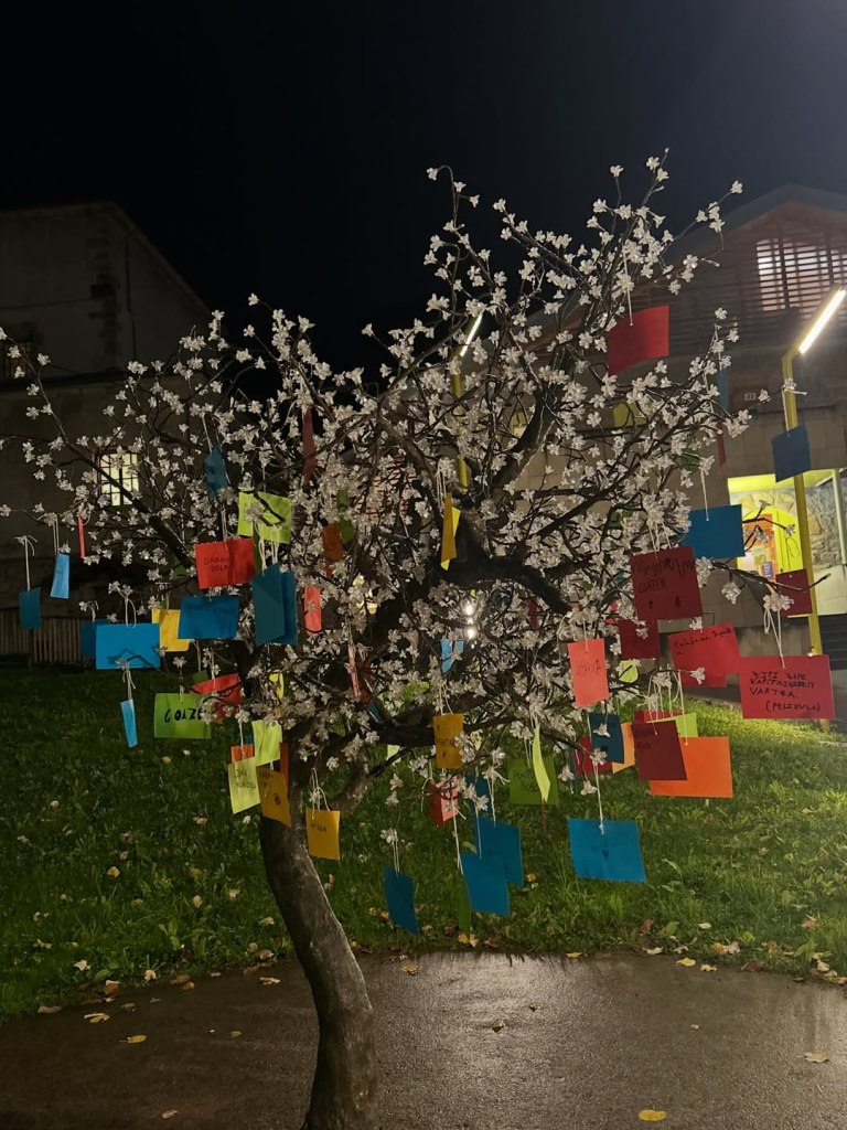 [cas] El Día Internacional del Euskera es el 3 de diciembre, y también se celebró en Lemoa. Entre otras, se encendió el Árbol del Euskera en la entrada a Kotxepin: recoge, con cartulinas de colores, recomendaciones de libros, planes familiares, películas, canciones… hechas por los y las lemoaztarras; todas en euskera, como no. Ahora, luce espectacular el árbol.