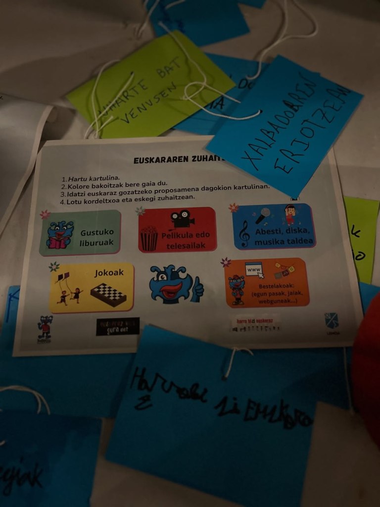 Además, gracias a la Asociación de Padres y Madres se repartió chocolate caliente a todos aquellos que acudieron al acto. También hubo teatro, de la mano de la compañía Lanku, que presentó la obra ‘Txepeldunak’. Al finalizar el acto los allí presentes pudieron llevarse a casa un tríptico preparado por la Ludoteka con una lista de recomendaciones para disfrutar en euskera.
