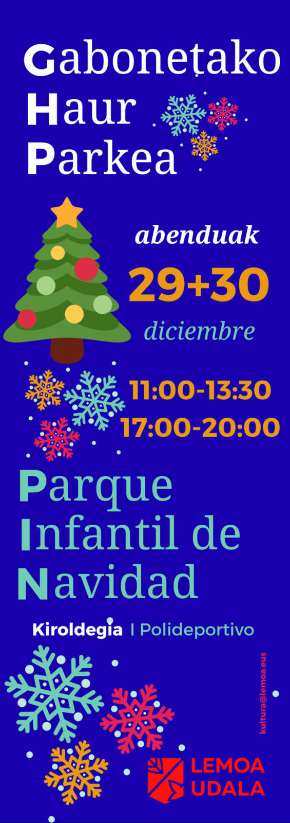 [Eus] Gabonetako Haur Parkea bi egunetan egongo da aurten zabalik: abenduaren 29an eta 30ean, goiz eta arratsalde irekiko ditu ateak. Erdu! [Cas] El Parque Infantil de Navidad estará abierto dos días, 29 y 30 de diciembre, de mañana y tarde. ¡Ven!