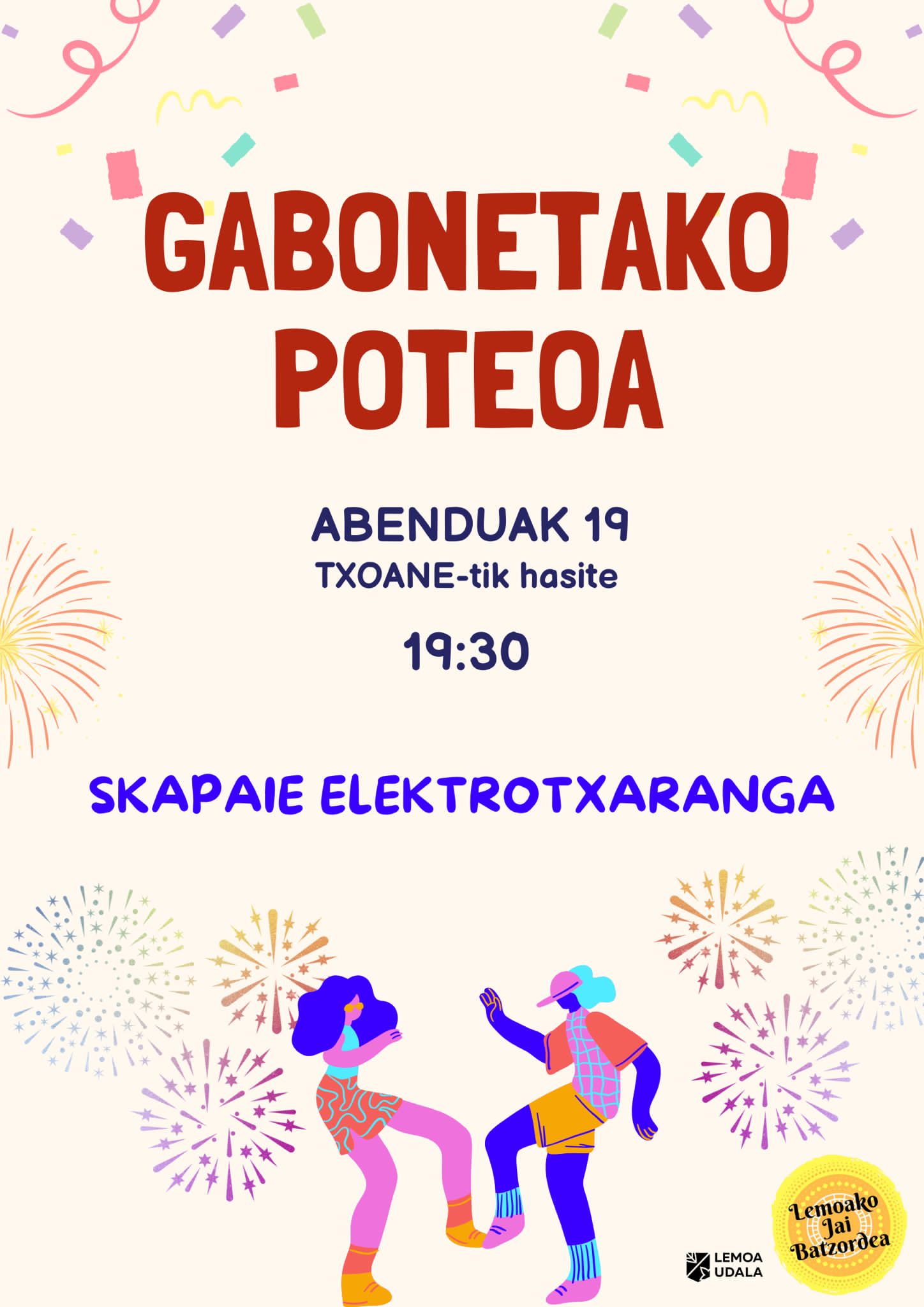 [Eus] Lemoako Udalak eta Jai Batzordeak Gabonetako poteoa antolatu dute bariku honetan, Txionetik. Skapaie elektrotxarangak alaitutko du iluntzea. Zatoz! [Cas] El Ayuntamiento de Lemoa y la Comisión de Fiestas han organizado un poteo navideño para este viernes, desde Txoane. La electrocharanga Skapaie amenizará la tarde ¡Vente!