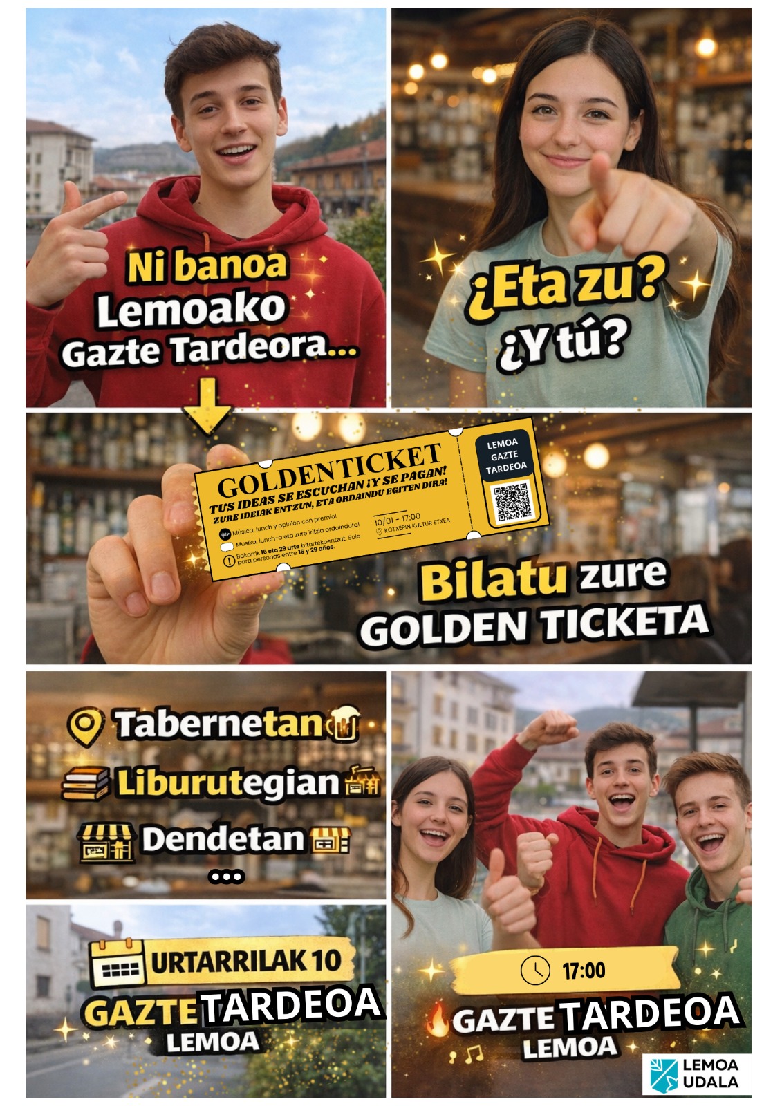[Eus] Lemoako Udalak Gazte Plana garatzen jarraitzen du, eta gazteen iritziak bildu nahi ditu. Horretarako, Gazte Tardeoa antolatu du biharko: 17:00etatik aurrera, Kotxepinetik hasita, Gazteriaren Plan Estrategikoaren diseinua egingo da, musikak lagunduta. Gazteen iritzia funtsezkoa da aukera, espazio eta jarduera gehiago izango dituen Lemoa eraikitzeko. Izena eman, aurkitu Golden Ticket-a eta irabazi 30 euro parte … Irakurtzen jarraitu Astebururako plana: Gazteplana. Lemoako Udalak gazteriari dei egin dio ideiak jasotzeko / Plan para el fin de semana: Gazteplana. El Ayuntamiento de Lemoa convoca a la juventud para activar ideas