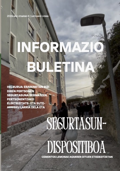 [Eus] Lemoako Udalak informazio-buletin bat argitaratu du Cementos Lemonako etxebizitzetan egindako segurtasun-dispositiboari buruz. Era berean, Esther Iturrioz alkateak jardunari buruzko xehetasunak eman zituen eguaztenean egindako Osoko Bilkuran. Hemen irakurri dezakezue. [Cas] El Ayuntamiento de Lemoa ha publicado un boletín informativo sobre el dispositivo de seguridad realizado en las viviendas de Cementos Lemona. Asimismo, la alcaldesa Esther Iturrioz dio todos los detalles sobre la actuación en Pleno celebrado … Irakurtzen jarraitu Lemoako Udalak Agarreko segurtasun-dispositiboaren berri eman du / El Ayuntamiento de Lemoa ha informado sobre el dispositivo de seguridad de Agarre