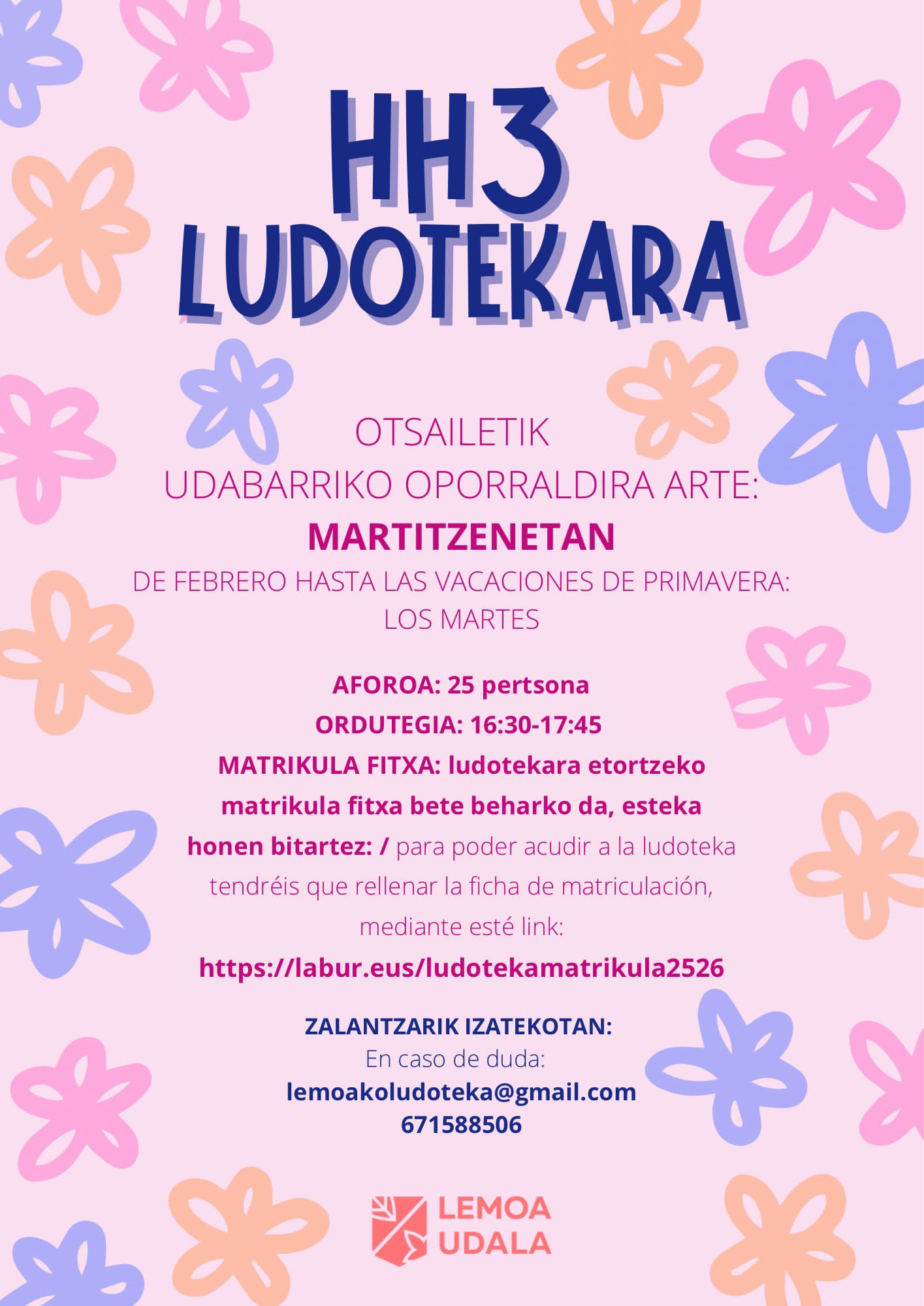 [Eus] Lemoako ludotekan izena emateko epea zabalik dago HH3ko haurrentzat. Zerbitzua otsailetik udaberriko oporraldira arte eskainiko da, martitzenetan. Hona hemen xehetasun nagusiak: Zalantzarik izanez gero, idatzi lemoakoludoteka@gmail.com helbidera edo deitu 671 588 506 zenbakira. [Cas] La ludoteca de Lemoa ha abierto el plazo de inscripción para el alumnado de HH3. El servicio se ofrecerá los martes, desde febrero hasta las vacaciones de primavera. Detalles de … Irakurtzen jarraitu Zatoz ludoteraka! Izen ematea zabalik / ¡Vente a la ludoteca! Abierta el plazo de inscripción