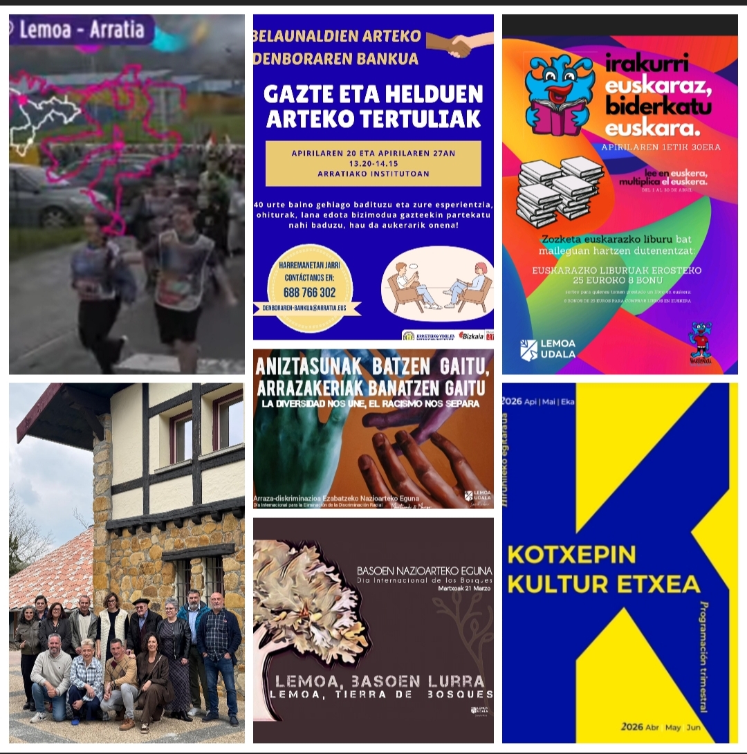 Atalak Udal buletina- Boletín digital UDALemoa [ESP] UDALemoa [EUS] Udal Buletina Martiak 27 de marzo Gehiago irakurri titularraren gainean klikatuz Leer más haciendo clic sobre el titular Post author Garatzailea: lemoatzen Post date 2026-03-27 Boletín Municipal LEMOAK KORRIKAN PARTE HARTZEN DU ETA EUSKARAREN ERABILERA INDARTZERA DEITU DU – LEMOA SE SUMA A LA KORRIKA Y A REFORZAR EL USO DEL EUSKERA LEMOAK BAT EGIN DU ARRAZA-DISKRIMINAZIOA EZABATZEKO NAZIOARTEKO EGUNAREKIN – LEMOA SE SUMA AL DÍA INTERNACIONAL PARA LA ELIMINACIÓN DE LA DISCRIMINACIÓN RACIAL LEMOAK BASOEN NAZIOARTEKO EGUNA OSPATU DU 200 HARITZ AUTOKTONO BANATUTA – LEMOA SE HA SUMADO AL DÍA MUNDIAL DE LOS BOSQUES CON EL REPARTO DE 200 ROBLES AUTÓCTONOS KANAL OFIZIALA MARTXAN, LEMOAKO UDALAK WHATSAPP BIDEZKO INFORMAZIO ZERBITZUA ABIAN JARRI DU – NUEVO CANAL OFICIAL, EL AYUNTAMIENTO DE LEMOA LANZA UN SERVICIO DE INFORMACIÓN A TRAVÉS DE WHATSAPP LEMOAKO KOTXEPIN KULTUR ETXEAK UDABERRIKO KULTUR PROGRAMAZIOA AURKEZTU DU – LA CASA DE CULTURA KOTXEPIN DE LEMOA PRESENTA SU PROGRAMACIÓN CULTURAL DE PRIMAVERA IRAKURRI EUSKARAZ, BIDERKATU EUSKARA/ LEE EN EUSKERA, IMPULSA EL EUSKERA. GARBIGUNE MUGIKORRA LEMOARA HELDUKO DA – EL GARBIGUNE MÓVIL LLEGARÁ A LEMOA BARIKU ARRASTIKO BERBALAGUN TALDEAN LEKUA DAGO! – ¡HAY PLAZAS EN EL GRUPO BERBALAGUN DE LOS VIERNES POR LA TARDE! LEMOAKO UDALAK BIZKAIKO KULTURA GUNE BERRIAREN INAUGURAZIORA JO DU ETA ESKUALDEKO PROIEKTUEN BALIOA NABARMENDU DU – EL AYUNTAMIENTO DE LEMOA ASISTE A LA INAUGURACIÓN DE UN NUEVO ESPACIO CULTURAL EN BIZKAIA Y DESTACA EL VALOR DE LOS PROYECTOS COMARCALES ARRATIAKO DENBORAREN BANKUAK BELAUNALDIEN ARTEKO SOLASALDIETARA GONBIDAPENA EGIN DU ARRATIAKO INSTITUTUAREKIN — EL BANCO DEL TIEMPO DE ARRATIA INVITA A PARTICIPAR EN TERTULIAS INTERGENERACIONALES JUNTO AL INSTITUTO DE ARRATIA Comparte: Share on X (Opens in new window) X Share on Facebook (Opens in new window) Facebook Atsegin dut Kargatzen... ← ARRATIAKO DENBORAREN BANKUAK BELAUNALDIEN ARTEKO SOLASALDIETARA GONBIDAPENA EGIN DU ARRATIAKO INSTITUTUAREKIN — EL BANCO DEL TIEMPO DE ARRATIA INVITA A PARTICIPAR EN TERTULIAS INTERGENERACIONALES JUNTO AL INSTITUTO DE ARRATIA