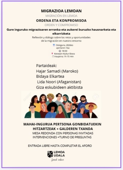 [eus]Lemoako Udalak pasa den astean “Orden y compromiso: diálogos sobre los retos y oportunidades de la migración en nuestro entorno” jardunaldia antolatu zuen, herritarrak, gizarte-eragileak eta adituak bildu zituen hausnarketa partekaturako gune gisa. Ekimenaren helburua izan zen testuinguru anitzean bizikidetzaren erronkak eta aukerak aztertzea. Saioa Esther Iturrioz alkatearen hitzaldiarekin hasi zen. Hark azpimarratu zuen epe … Irakurtzen jarraitu LEMOAK MIGRAZIOARI, BIZIKIDETZARI ETA ETORKIZUNARI BURUZKO HAUSNARKETA EGIN DU JARDUNALDI PARTE-HARTZAILE BATEAN – LEMOA REFLEXIONA SOBRE MIGRACIÓN, CONVIVENCIA Y FUTURO EN UNA JORNADA PARTICIPATIVA