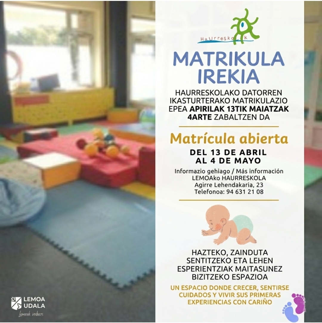 Lemoako Haurreskolan matrikulazio epea irekita dago, 0 eta 2 urte bitarteko haurrentzat. Izena emateko epea apirilaren 13tik maiatzaren 4ra bitartean izango da, familiei seme-alabak zaintza eta hezkuntza integrala uztartzen dituen espazio batean inskribatzeko aukera eskainiz.