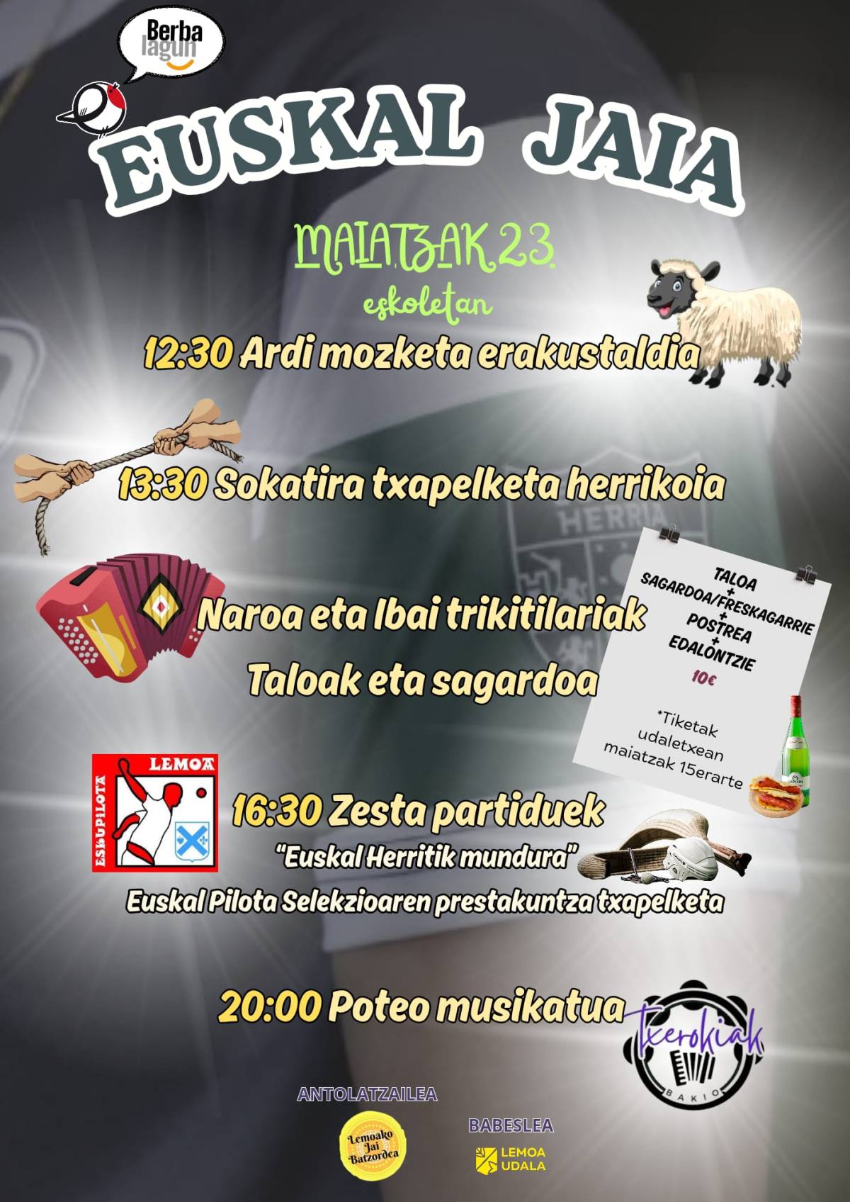 Bazkarirako tiketak 10 eurotan egongo dira salgai, eta taloa, sagardoa edo freskagarria, postrea eta edalontzia barne hartzen dituzte. Sarrerak udal bulegoetan eskuratu ahal izango dira maiatzaren 15era arte. Ekimena Lemoako Jai Batzordeak antolatu du, Lemoako Udalaren babesarekin.