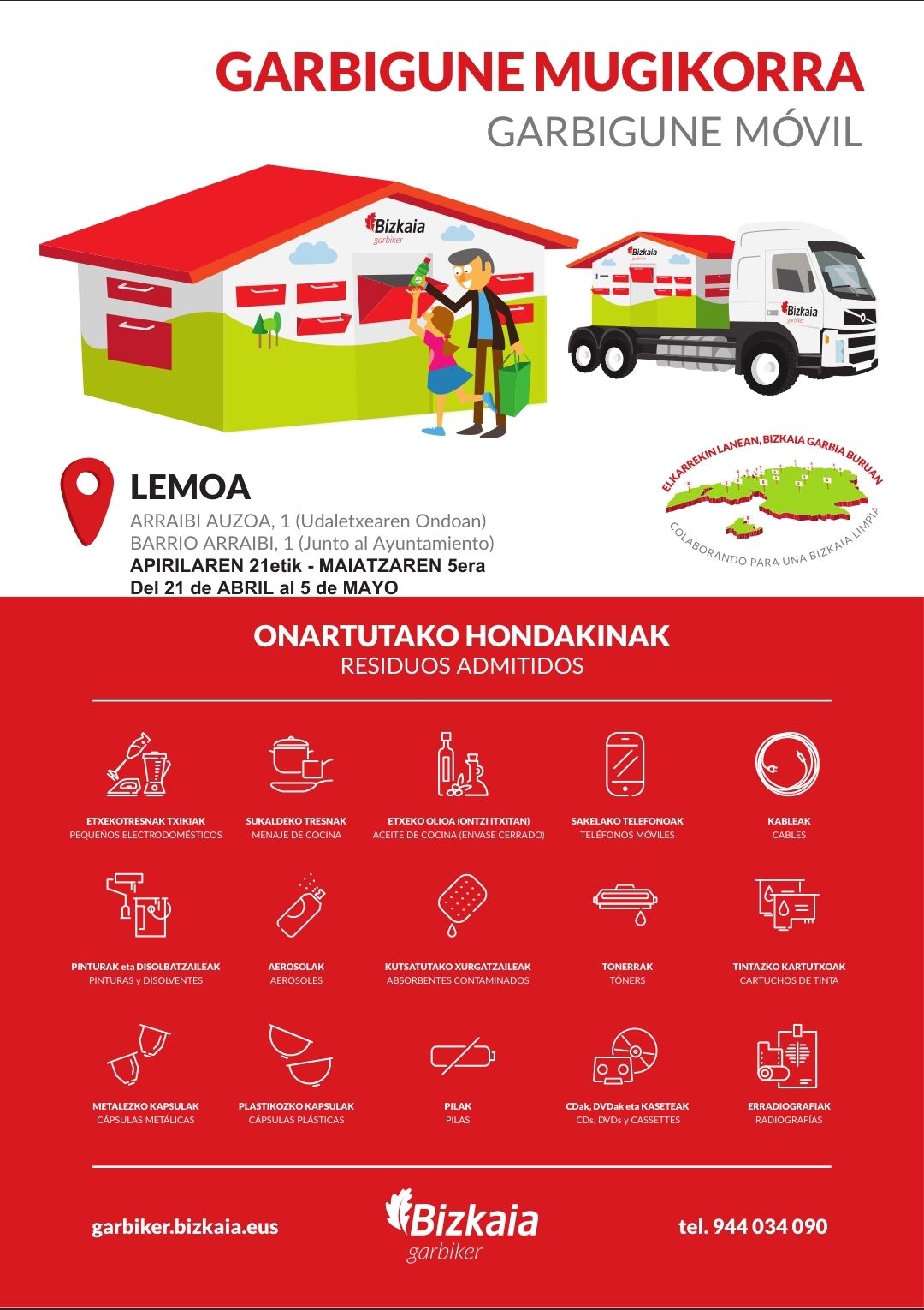 [eus] Garbigune mugikorra Lemoan dago jada, Arraibi auzoan (1 zenbakia), udaletxearen ondoan kokatuta, eta apirilaren 21etik maiatzaren 5era arte egongo da erabilgarri. Zerbitzu honen bidez, herritarrek ohiko edukiontzietan uzten ez diren hondakinak modu egokian kudeatzeko aukera izango dute.