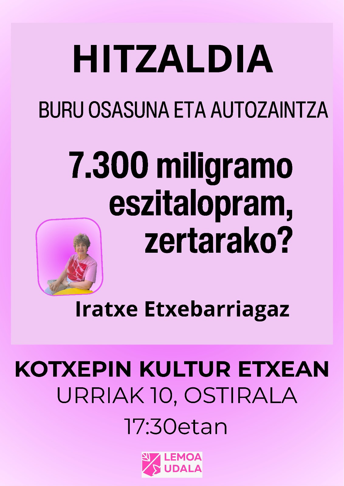 [eus] Buru Osasunaren Nazioarteko Eguna dela eta, gaur, urriaren 10ean, hitzaldia izango da Kotxepin Kultur Etxean: «7.300 miligramo eszitalopram, zertarako?», Iratxe Etxebarriaren eskutik. Saioan buru osasuna zaintzearen garrantziaz eta autozaintza gure bizitzaren erdigunean jartzearen beharrari buruz arituko da, begirada hurbil eta zintzo batetik. Eguneroko erritmoari, emozioei eta ongizaterako ditugun baliabideei buruz hausnartzeko gonbita izango da. […]