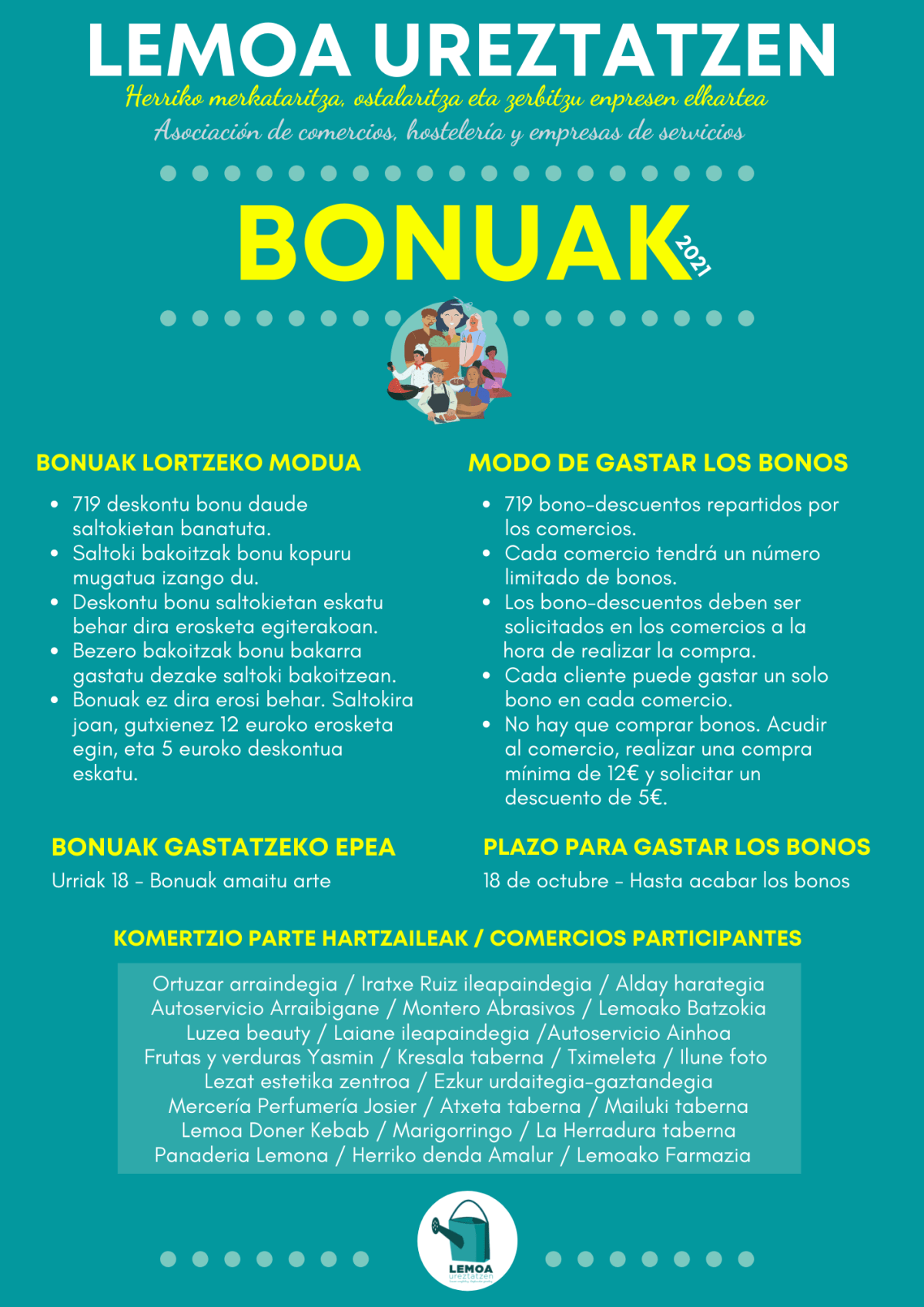 Después de la firma del convenio entre el Ayuntamiento de Lemoa y la Asociación de Comerciantes, llega la primera campaña de la asociación. La asociación de comerciantes, hostelería y empresas de servicios de Lemoa (Lemoa Ureztatzen), junto con la colaboración del Ayuntamiento de Lemoa, destina 3.595€ para la subvención de 719 bonos.